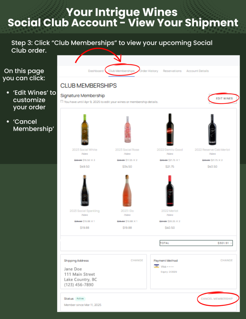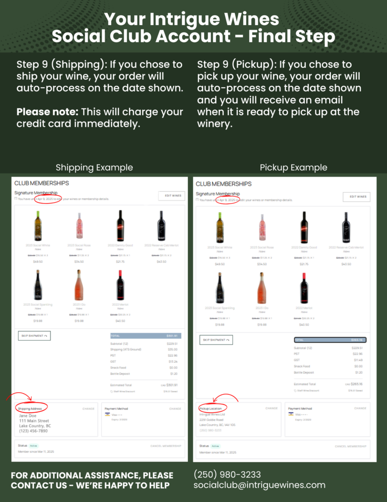 Remember, if you have any questions, our team is here to help—just reach out at socialclub@intriguewines.com or call us at 250-980-3233.